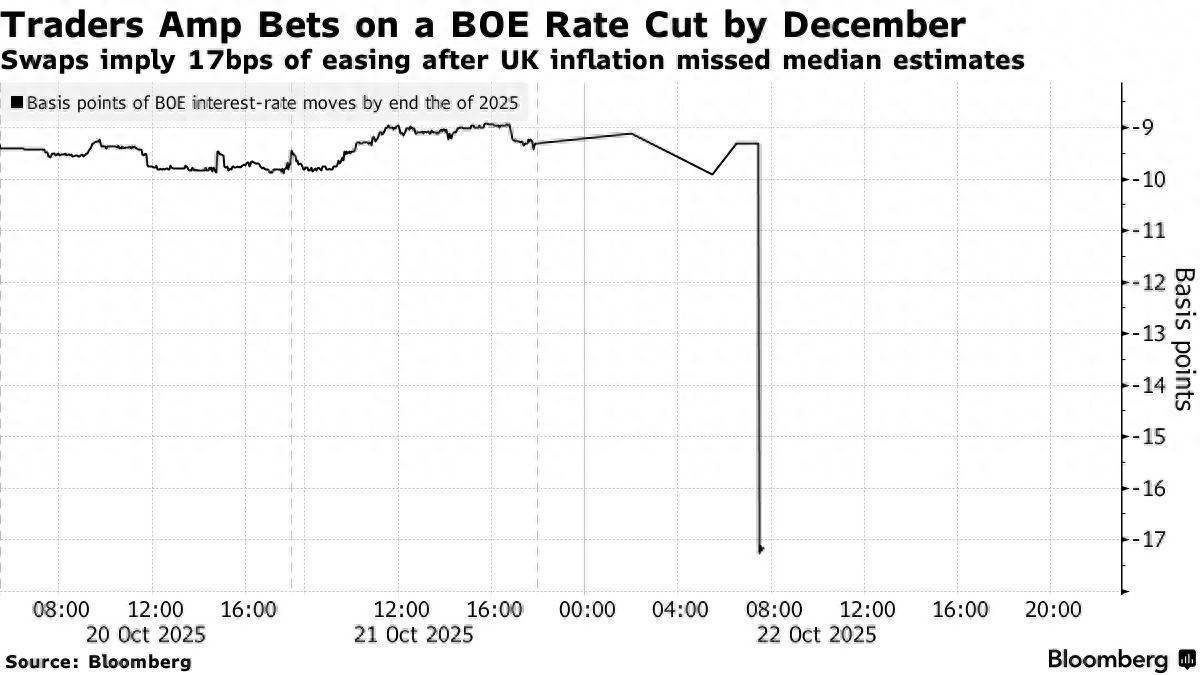 由于通胀保持稳定,交易员加大了对英国央行降息的押注。货币市场目前预计,英国央行到12月底前将降息17个基点,相当于降息25个基点的可能性约为70%。而在英国9月CPI数据公布前,货币市场认为英国央行到12月底前降息的几率略高于三分之一。
