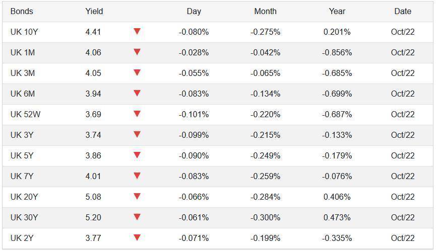 在降息预期升温的同时,对货币政策敏感的两年期英国国债收益率一度下跌10个基点,至3.75%,为2024年8月以来的最低水平。在两年期英国国债的上涨的带动下,其他期限英国国债同样上涨。此外,英镑兑美元汇率跌0.4%,至1英镑兑1.3320美元。