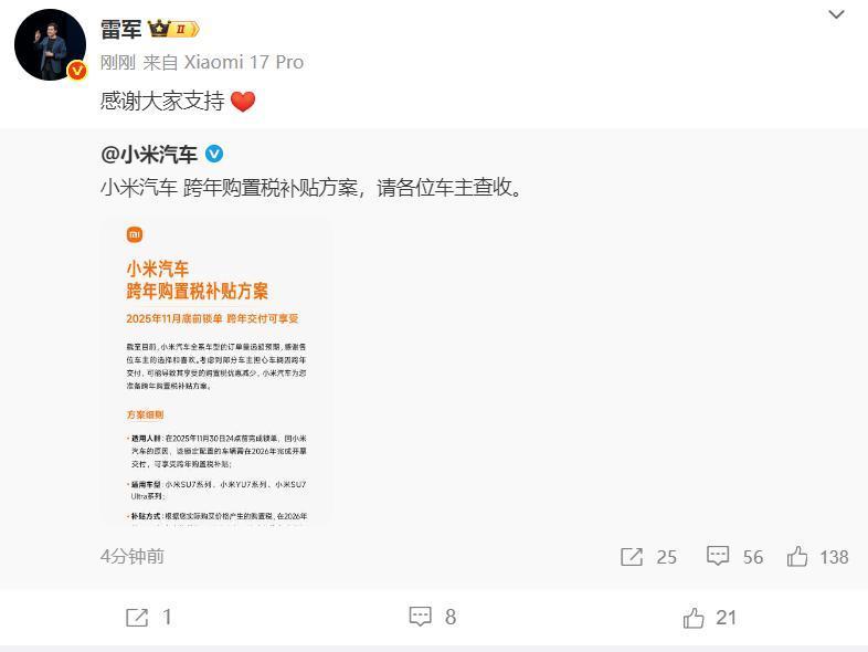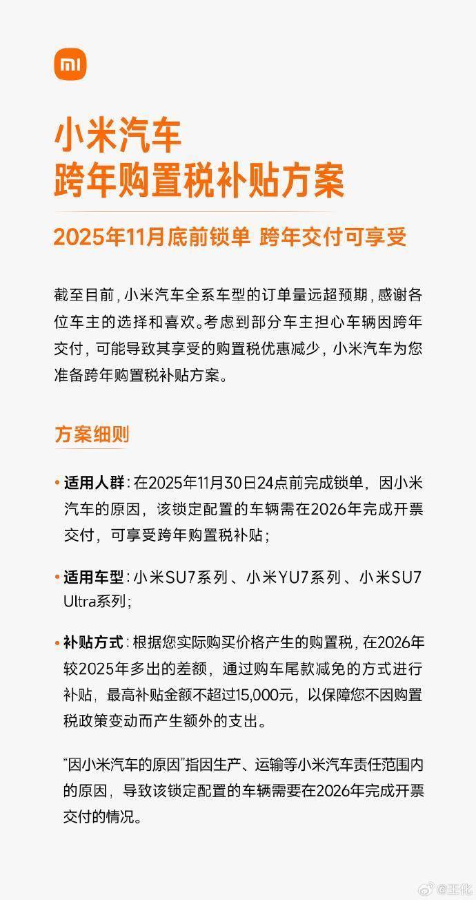 小米方面表示,凡在2025年11月30日24时前完成锁单,因小米汽车生产、运输等原因导致车辆需到2026年完成开票交付的用户,可享受“跨年购置税补贴”。