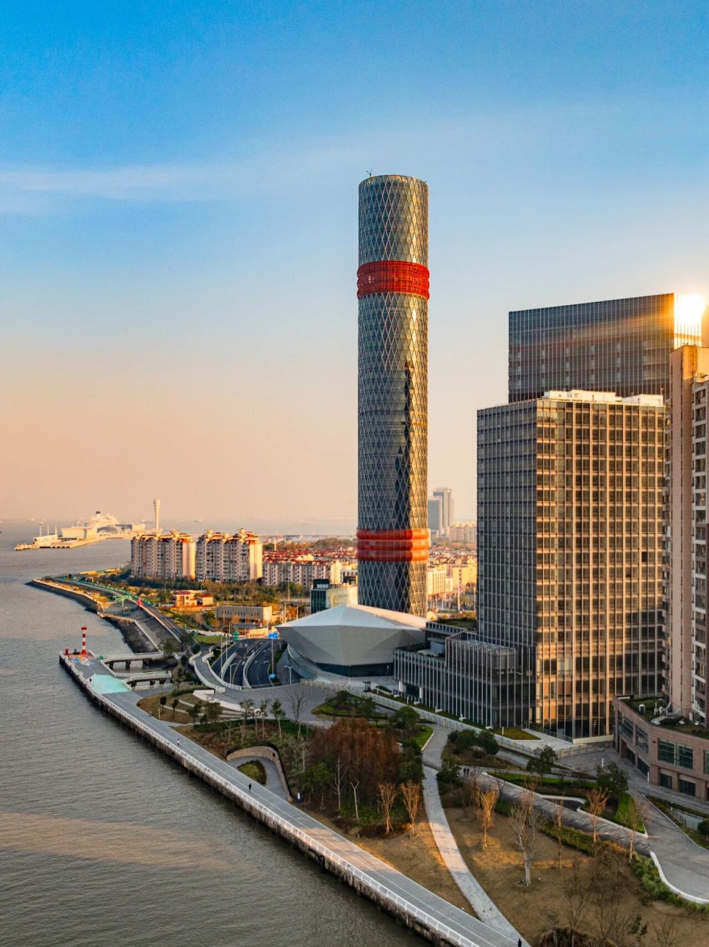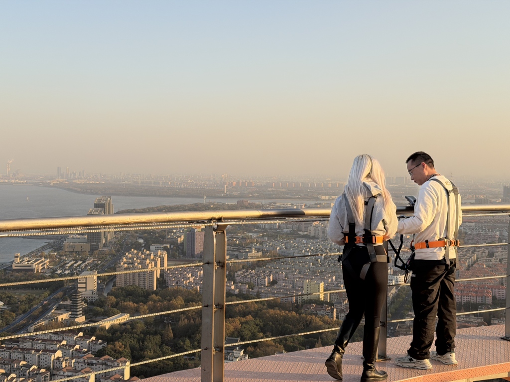 有趣的是,这枚“定海神针”最初其实是市政隧道的排风井,位置也与现在的有一段距离。设计师把它平移上百米,到了现在的位置,并重新设计。在180米楼顶,“定海神针”开放户外楼顶行走,楼顶正中心,一台户外高空秋千已在调试。将来,这里还将有天际攀岩、高空跳伞等一系列特色互动空间。“宝山是很多邮轮旅客的入境第一站,这个地方紧邻吴淞口国际邮轮港,今年刚开人气就很旺,也完全有潜力变‘流量’为‘留量’。”项目方说道。